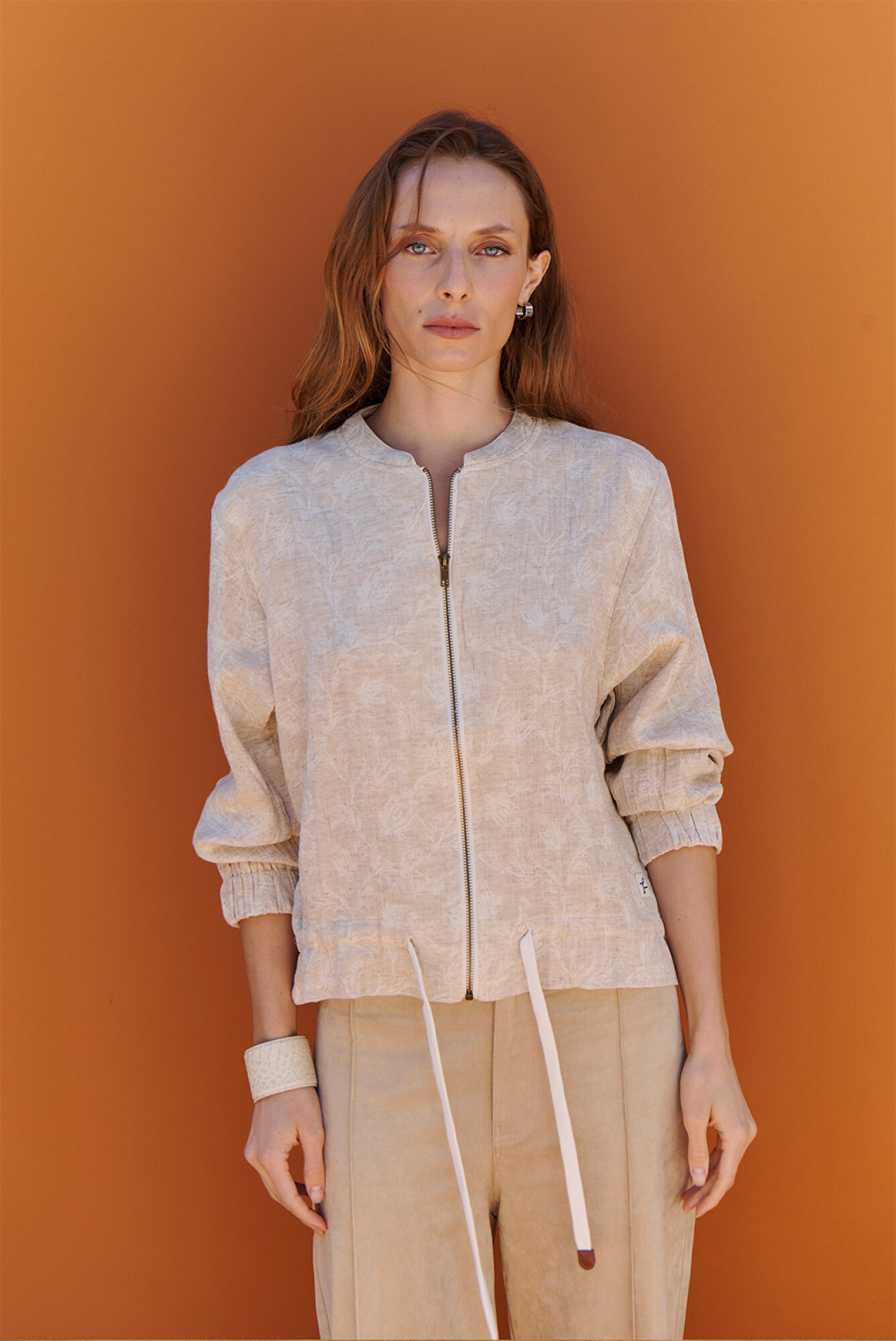 Eleva tu look con nuestra Bomber Tramada. Combina un diseño contemporáneo con detalles artesanales, confeccionada en materiales de alta calidad, ofrece una silueta moderna, ligera y cómoda. Se destaca por su cierre metálico frontal y su cintura regulable de algodón.