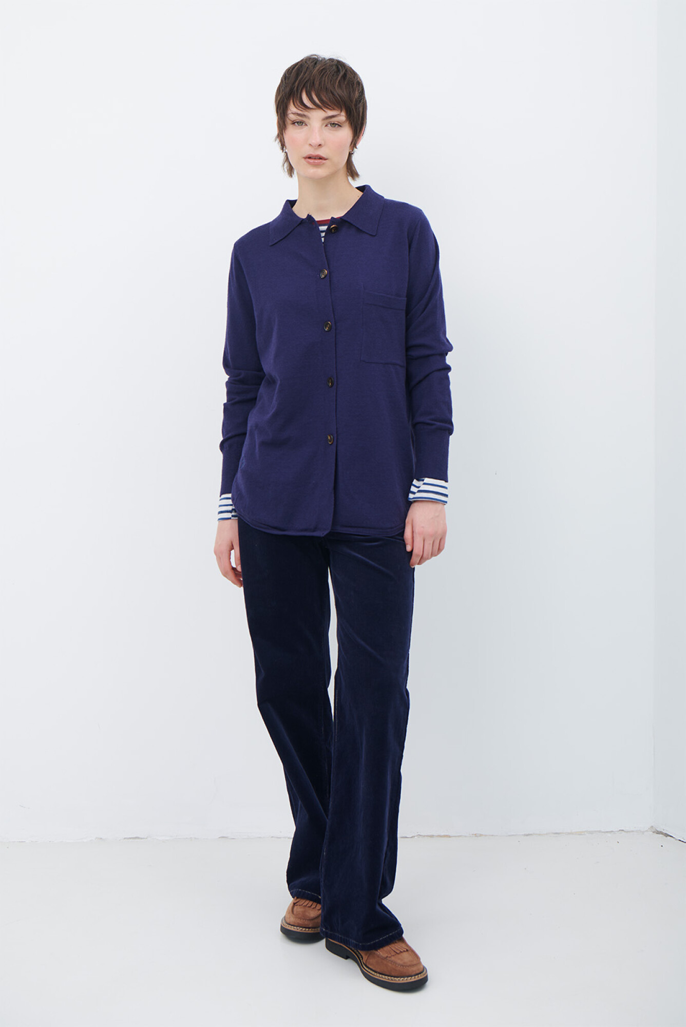 El Cardigan Long es una prenda versátil, cuenta con botones al frente y cuello clásico. Su diseño cómodo y relajado lo convierte en una opción ideal para superponer sobre distintos looks, aportando abrigo liviano y estilo en el día a día.