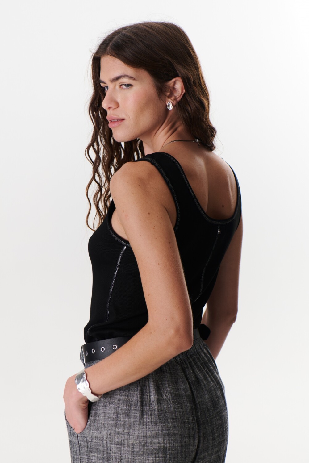 La Musculosa Inés es una prenda fresca y simple, la elección ideal para tu fondo de armario. Confeccionada en un tejido ligero, ofrece comodidad y frescura. Los detalles de collareta metalizada añaden un toque distintivo, mientras que su corte clásico y relajado con tirantes anchos la hacen perfecta para combinar con jeans o bermudas.