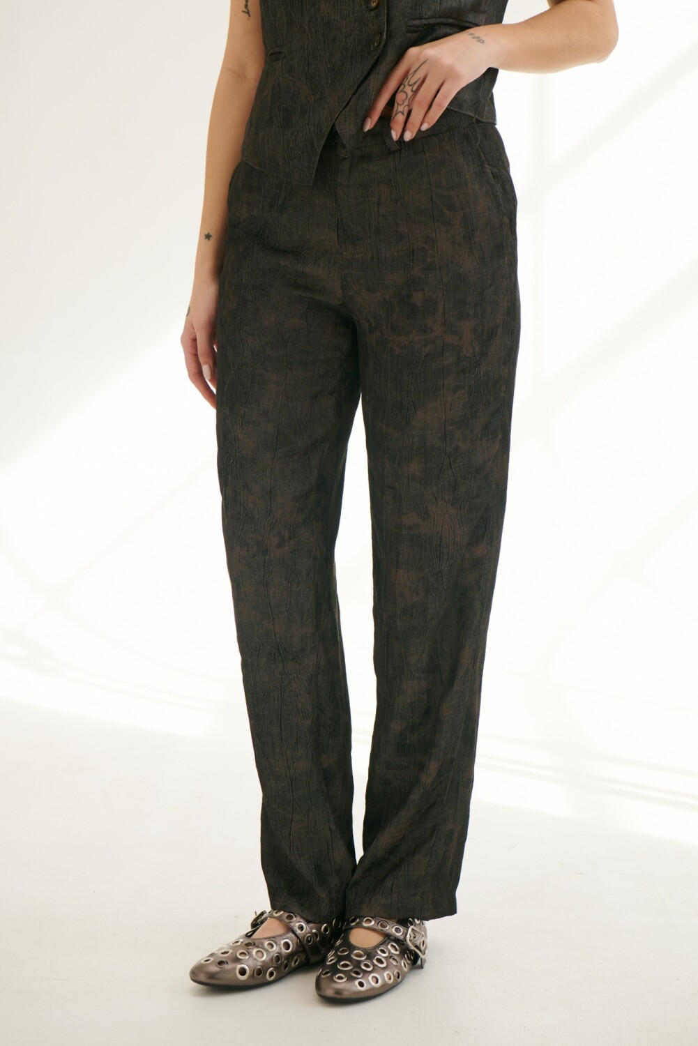 El Pantalon Tizzi es sinónimo de elegancia atemporal. Confeccionado en un tejido estampado y texturizado, este pantalón es perfecto para usar todo el año, ofreciendo comodidad y estilo. Perfecto para ir a la oficina o para eventos especiales.