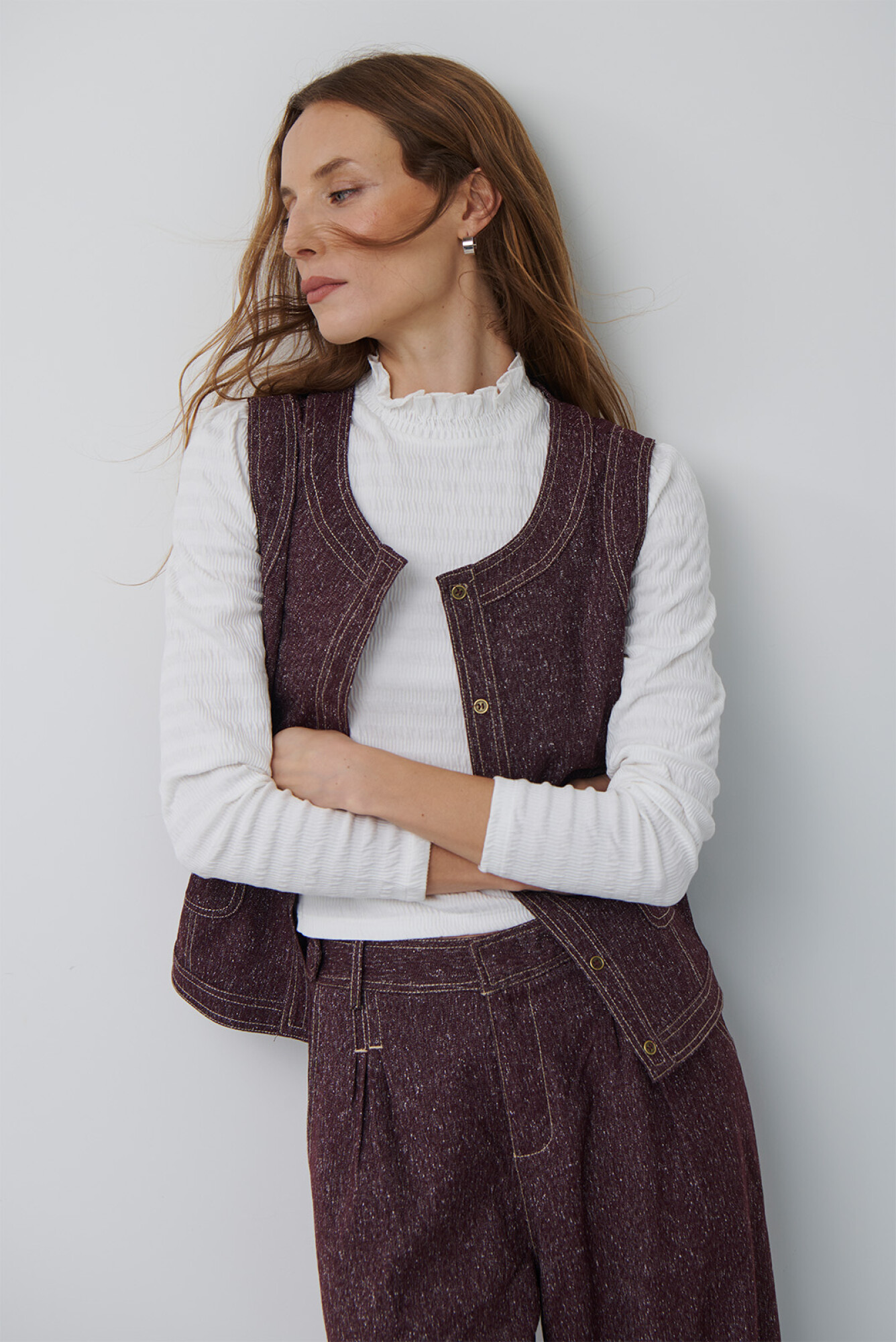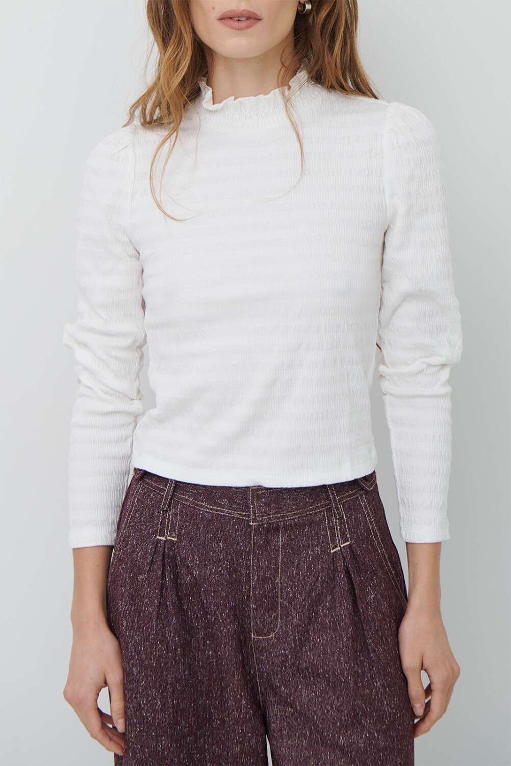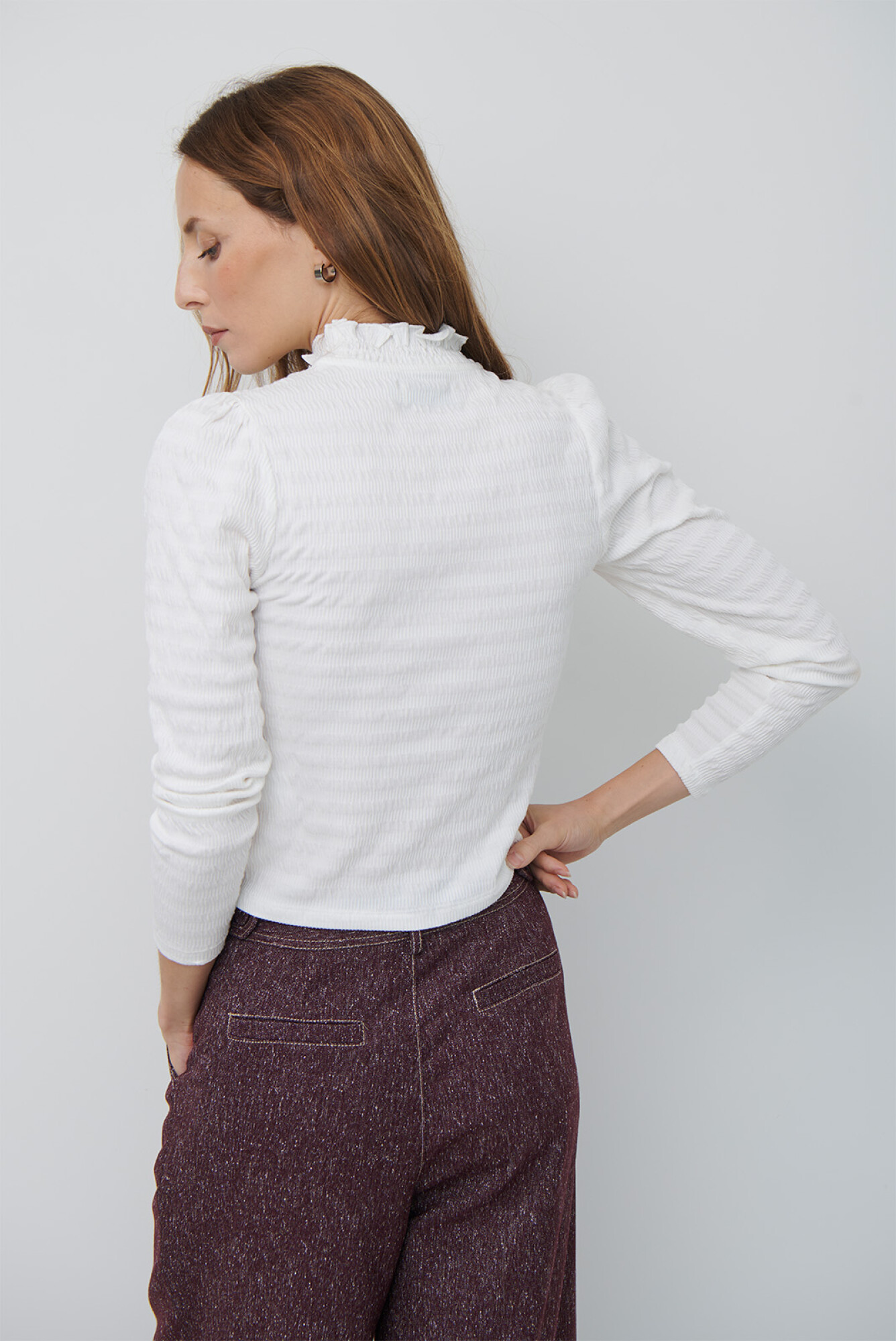 La Polera Suspiro está confeccionada en una tela de algodón suave y fresca. Se destaca por su textura y elasticidad. Su corte clásico con cuello la convierten en la opción ideal para tu fondo de armario.