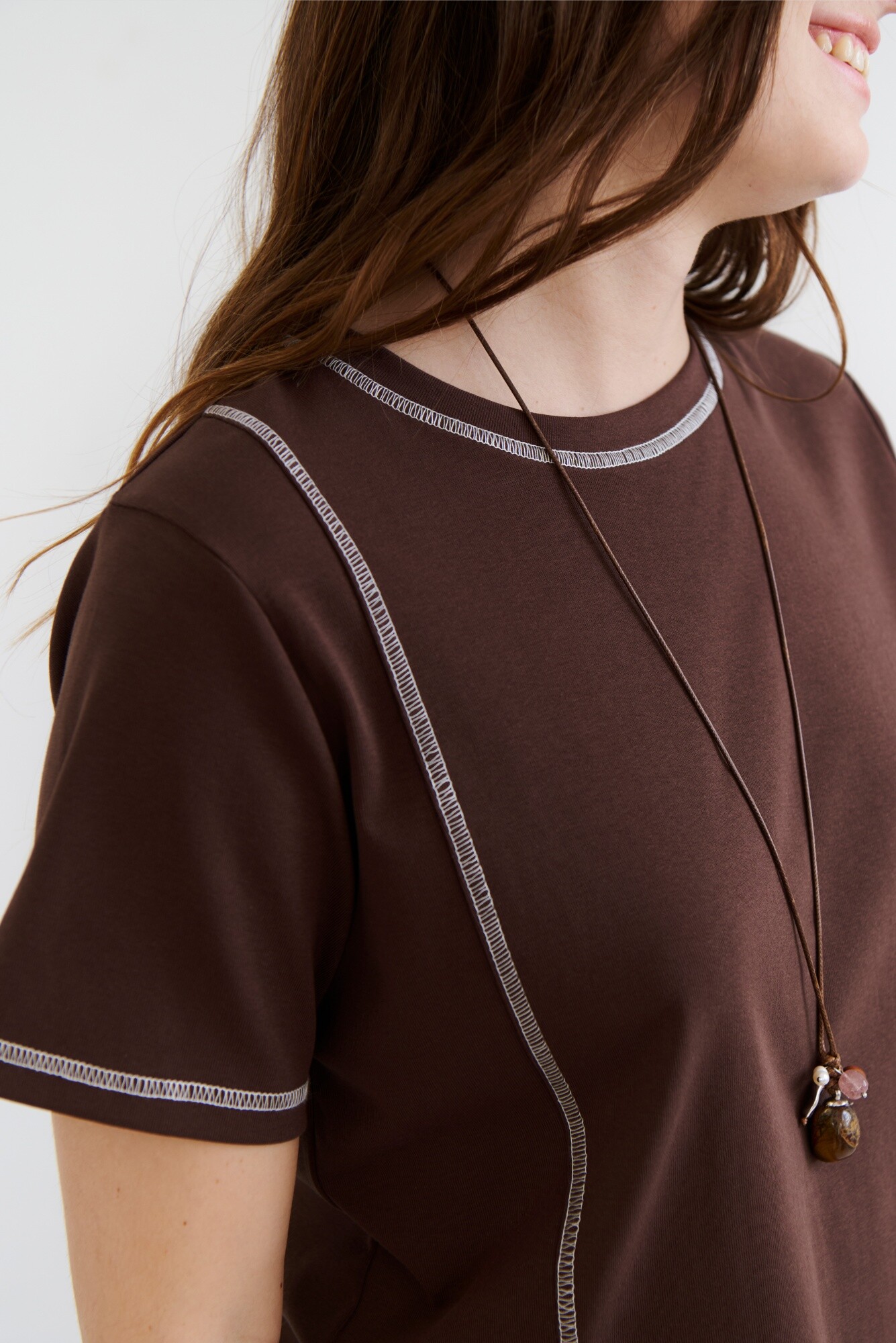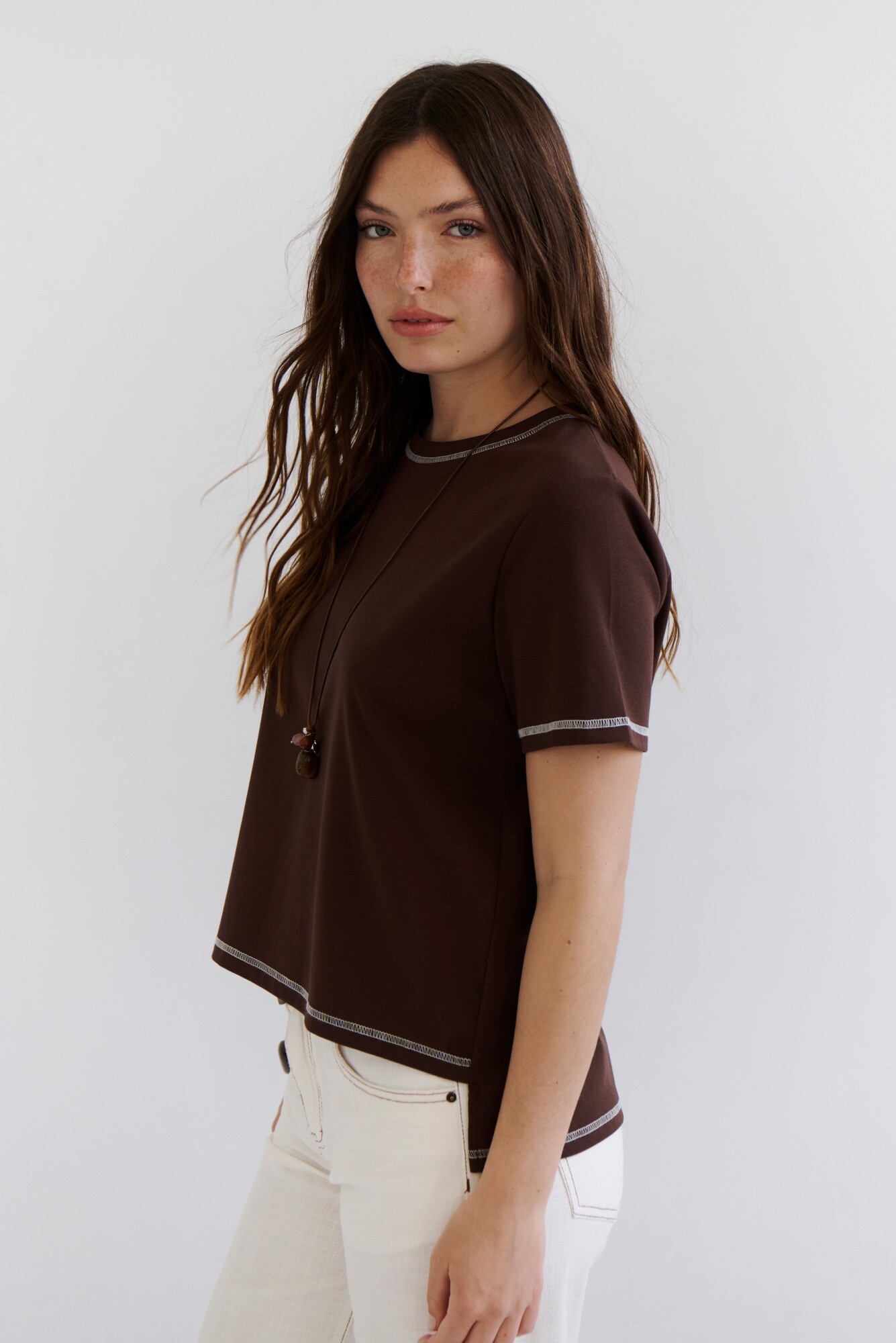 La remera Lara es un básico de algodón super suave que se destaca por sus pespuntes a contratono en el collareta y su pequeño corte lateral. Elegí el color que más te guste