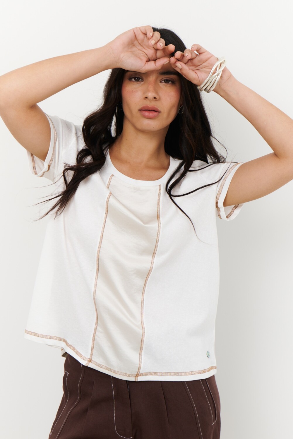 La Remera Satén combina la suavidad y frescura del algodón con el brillo y la elegancia del satén, una remera ideal para un look moderno y cómodo que se destaca por su bordado de collareta a contratono.