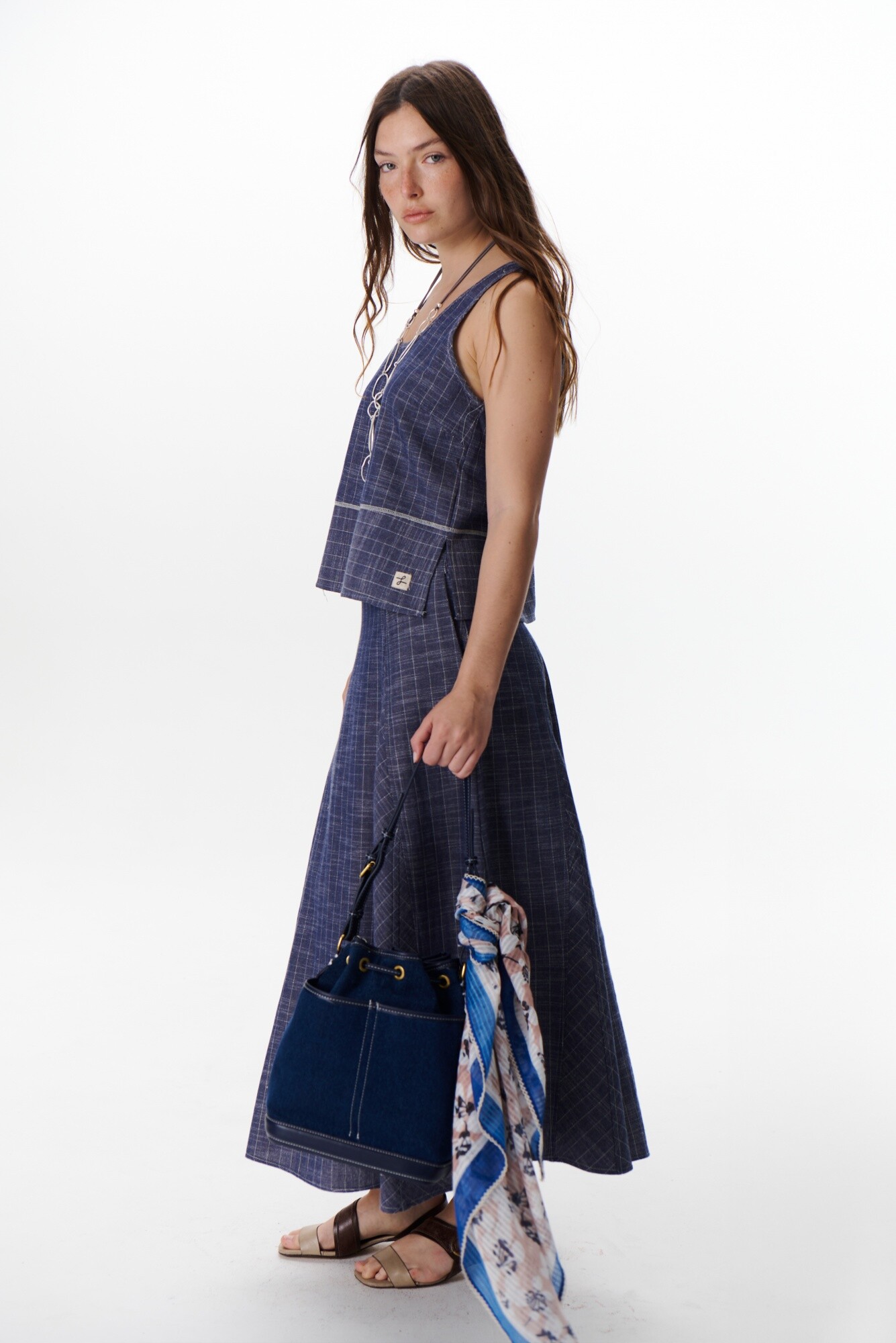 El Top Lino Raya cuenta con un corte clásico de cuello redondo y bretel ancho, perfecto para usar con soutien. Combínalo con la falda Lino Raya para un conjunto impecable.