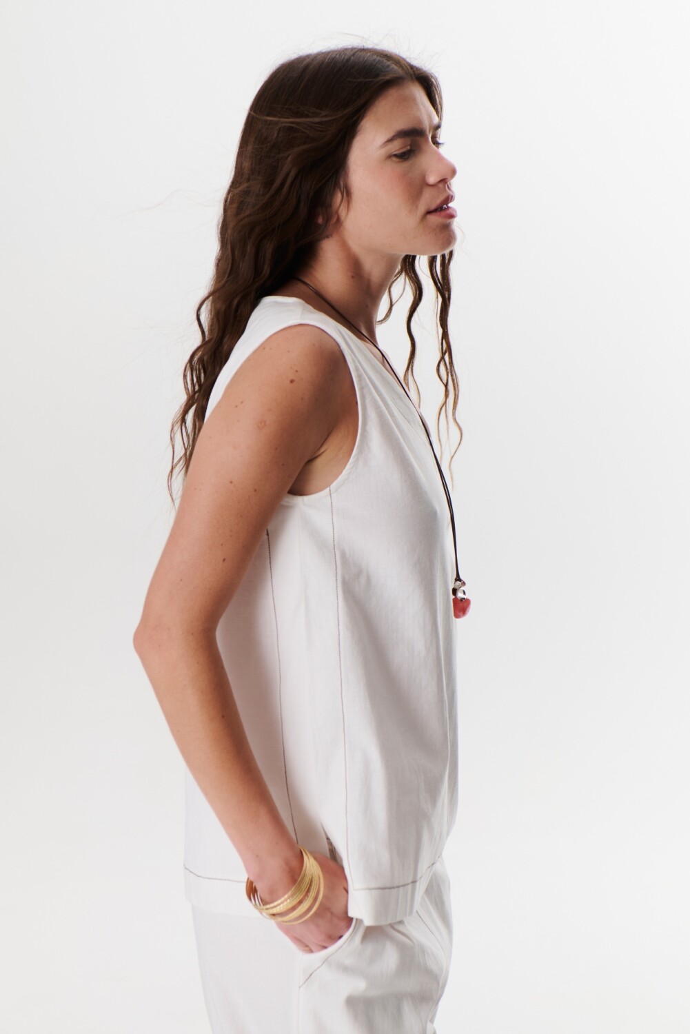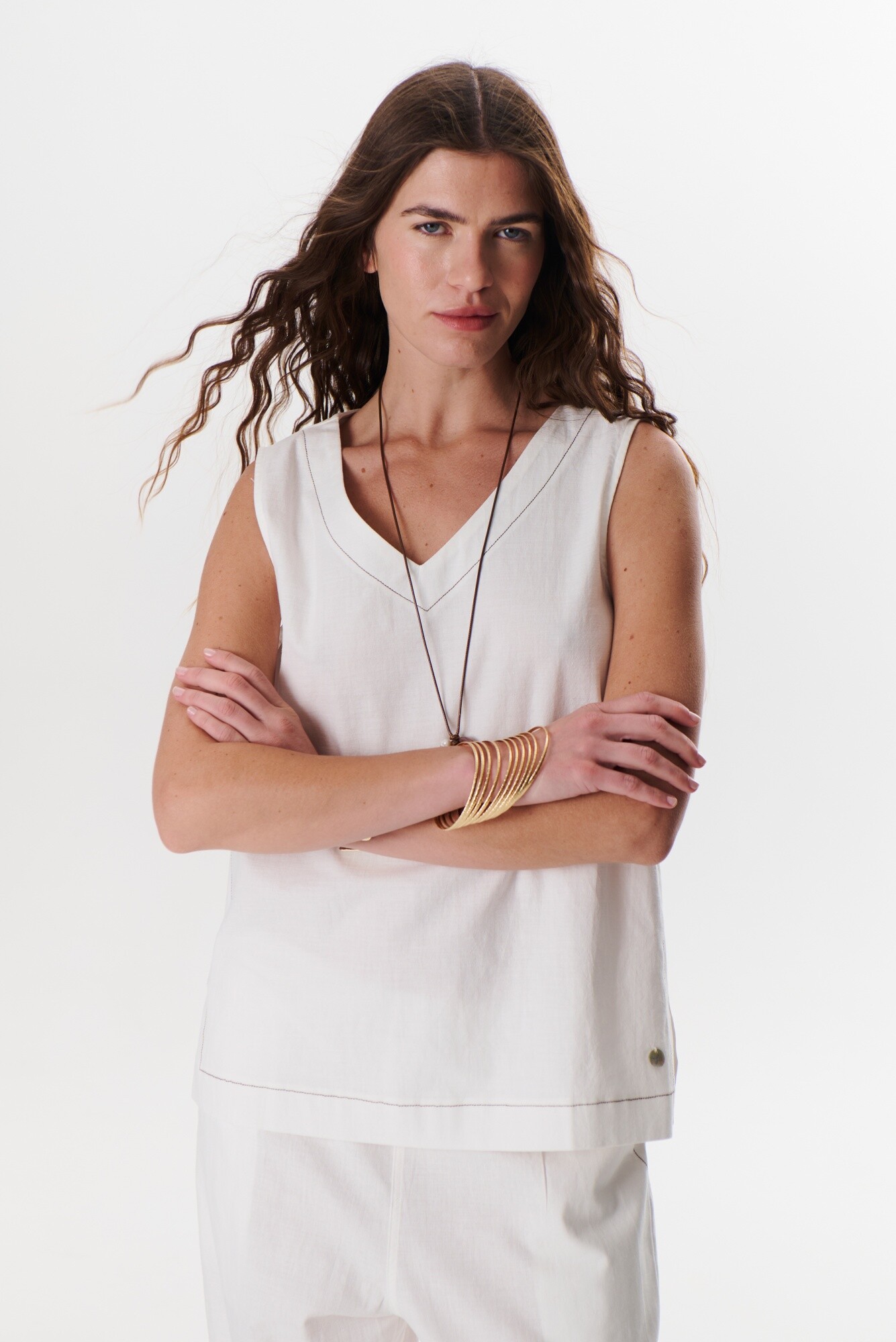 El Top Lino Stretch es la combinación perfecta de comodidad y estilo. Confeccionado en una mezcla de lino con un toque de elasticidad, se adapta a tu figura sin perder frescura. Su diseño ligero lo convierte en una opción ideal para los días cálidos. Con un corte moderno y detalles sutiles, este top es versátil y fácil de combinar con jeans, o crea el match perfecto con el Pantalón Lino Stretch para un conjunto impecable.