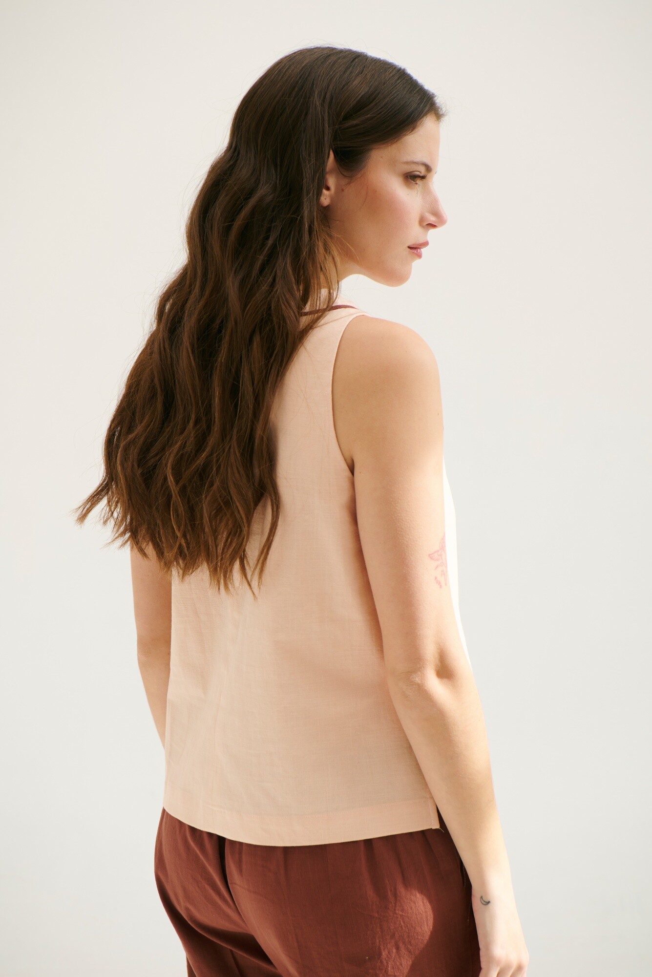 Las prendas de lino o con mezcla deben lavarse a mano con agua fría. No dejar en remojo, no centrifugar ni usar secadora. Planchar a un máximo de 60°.
