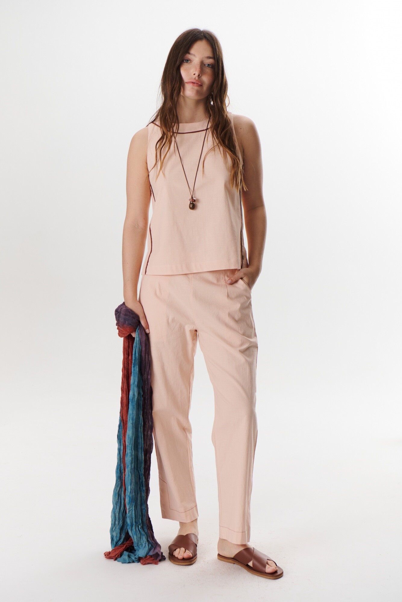El Top Lino Stretch Vivi se destaca por sus vivos a contratono que realzan tu figura. Su diseño es versátil y fácil de combinar con jeans, o crea el match perfecto con el Pantalón Lino Stretch para un conjunto impecable.