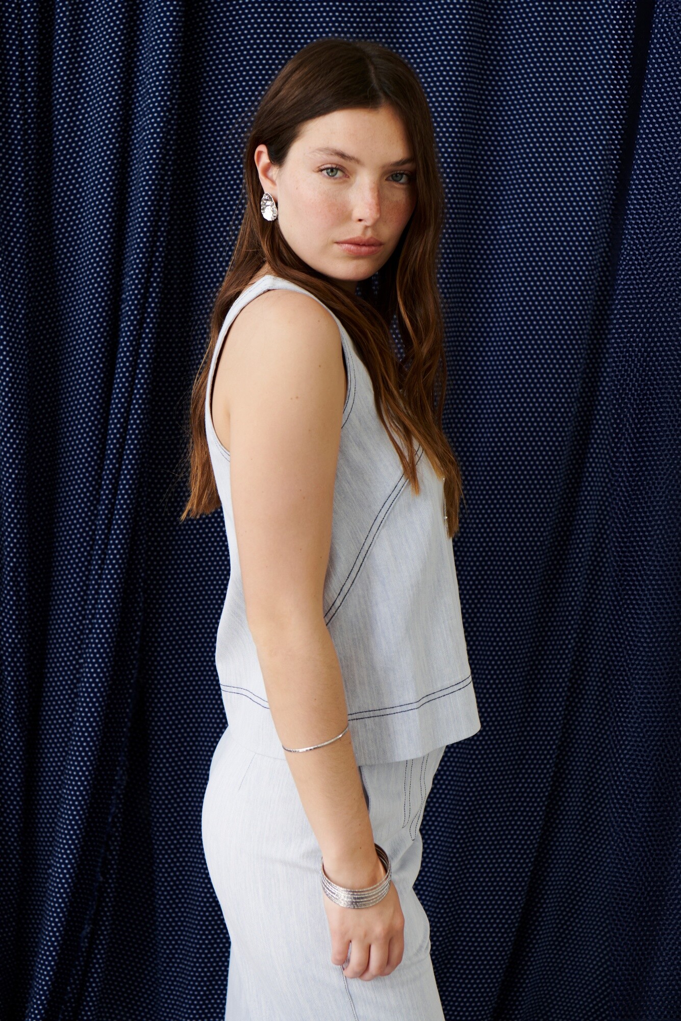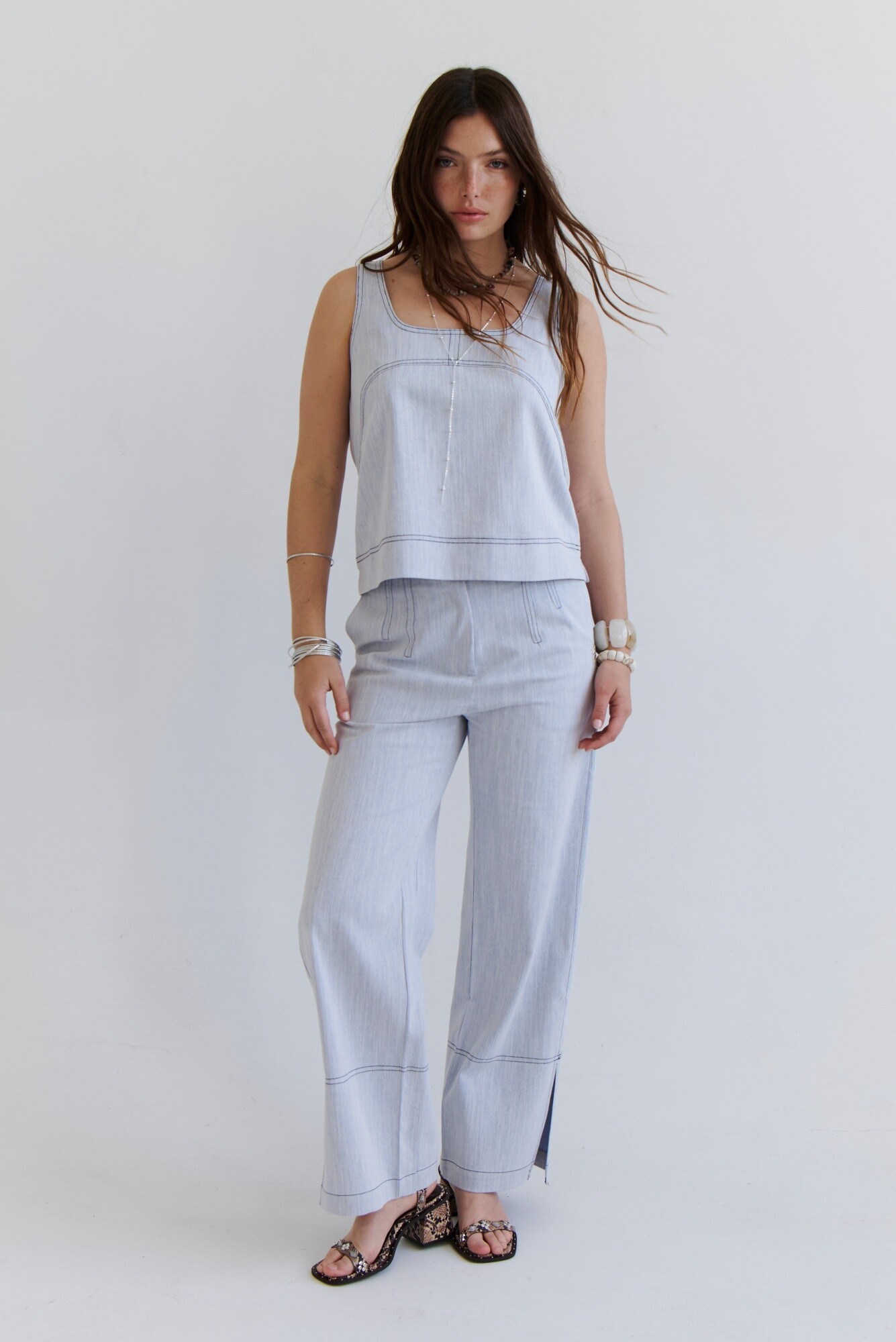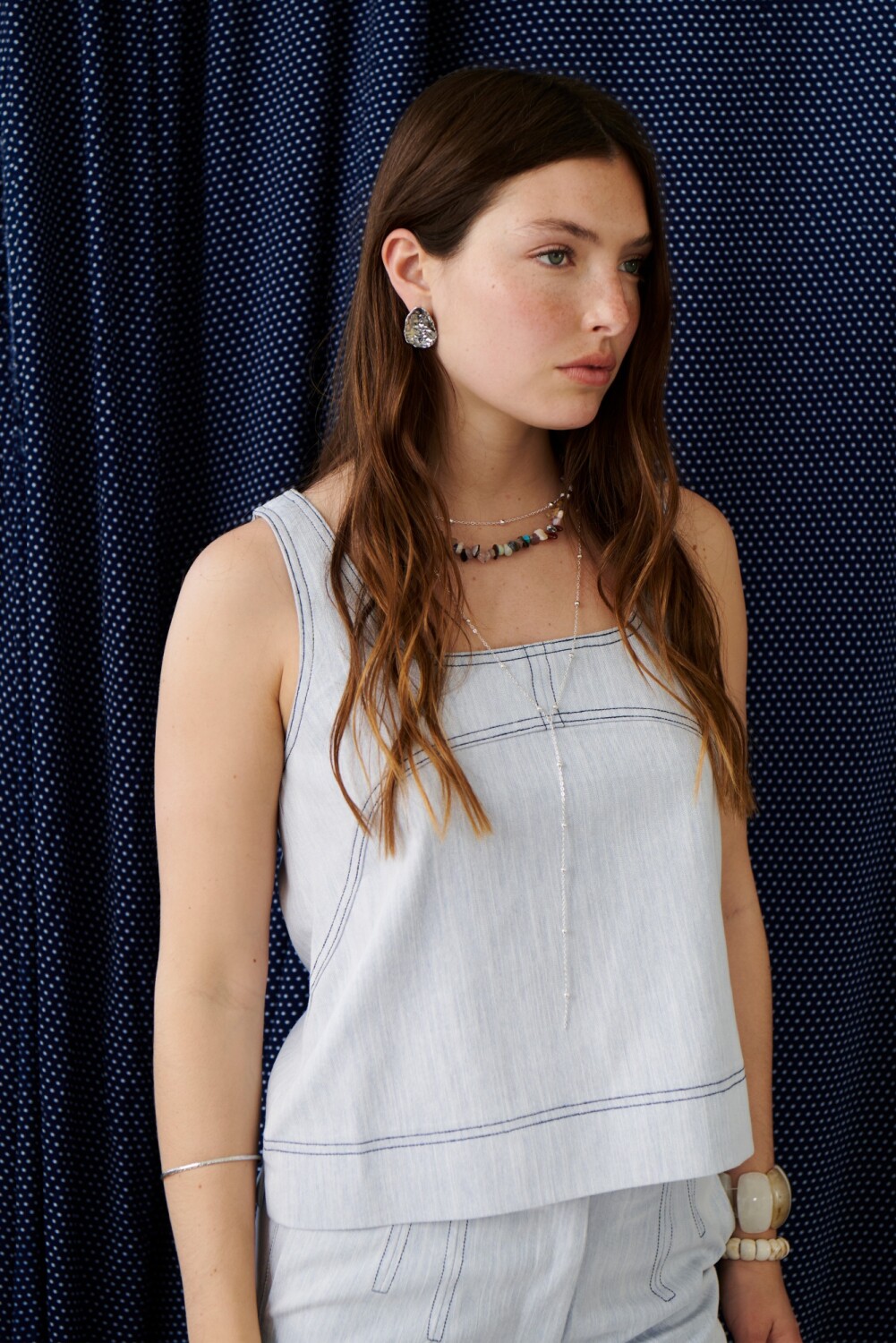 El Top Summer es esa prenda versátil que te va a salvar en más de una ocasión. Se destaca por sus cortes y detalles de pespuntes a contratono. Sus colores pastel lo hacen perfecto para llevar con jeans, o si preferís un look perfecto y monocromático combinalo con el pantalón Summer.